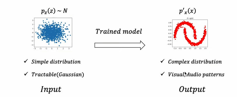대부분의 생성 모델은 본질적으로 latent variable을 활용한다. 매우 심플한 sample을 input으로 받아서 학습된 모델을 통해 오른쪽과 같은 특정한 패턴의 분포로 변환 혹은 생성한다. 생성모델 과제에서 필요한 것은 [1] input으로 들어갈 latent variable, [2] simple한 것을 complex하게 변화시킬 trained model이다.