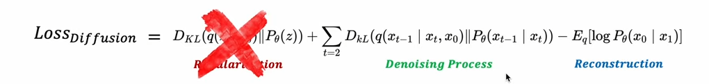 -> Denoising process : xT에서 x1까지 이어지는 reverse 과정인 denoising process를 학습하도록 가이드하는 Loss term.