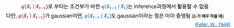 Diffusion process와 마찬가지로, Reverse process도 가우시안 분포가 된다. 전자는 (사전에 정의한 노이즈 크기인) Bt에 의해서 평균과 분산 정의된다. 즉 우리가 알고 있고, 만들 수 있는 분포다. 후자는 우리가 알지 못하는 조건부 가우시안 분포다.