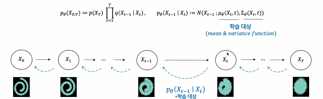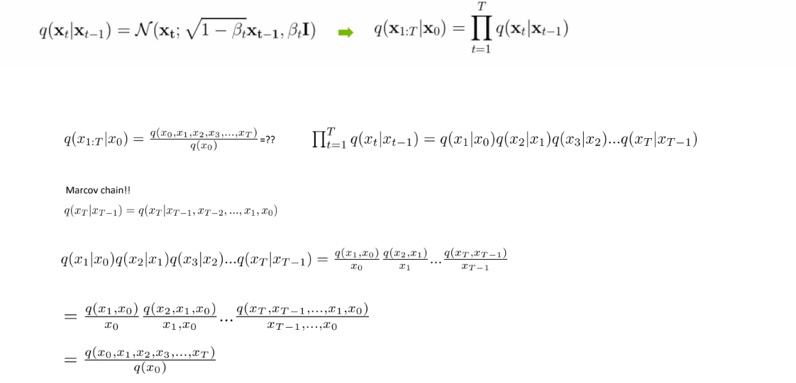 [2] Diffusion process, Sampling process 모두 조건부 확률 분포의 chain으로 이루어져 있다. (이전 state를 기반으로 다음 state를 상정한다.)